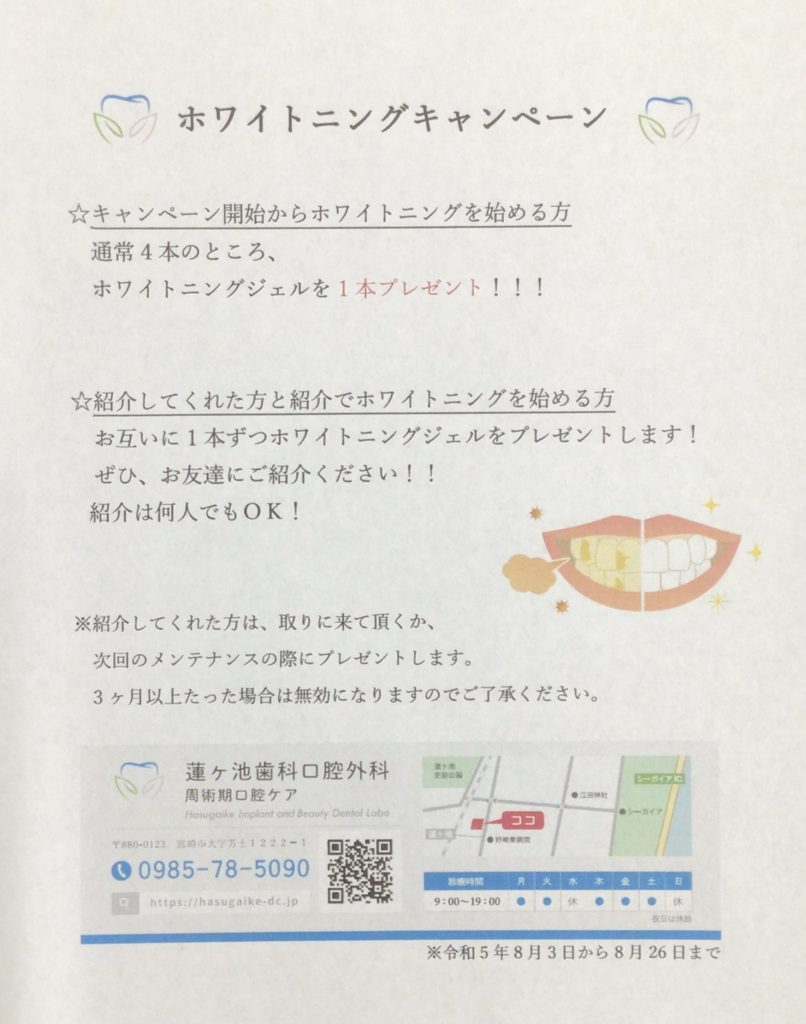 まもなく終了です! 投稿日 2023年8月19日 著者 staff カテゴリー お知らせ こんにちは‼︎蓮ケ池歯科口腔外科・周術期口腔ケアです✨ ホワイトニングキャンペーン実施中です♪ 8月26日土曜日までとなっております‼︎気になっている方はこの機会に是非 その他、自費診療が9月から値上げ予定です。気になる処置がある方はご相談に来て下さい #宮崎 #蓮ケ池 #アライナー矯正 #インプラント #ホワイトニング #スポーツ用マウスピース #ジルコニア #セラミック #親知らず抜歯 #白玉点滴 #口腔外科 #親知らず #周術期口腔ケア #マイナンバーカード #顎関節症