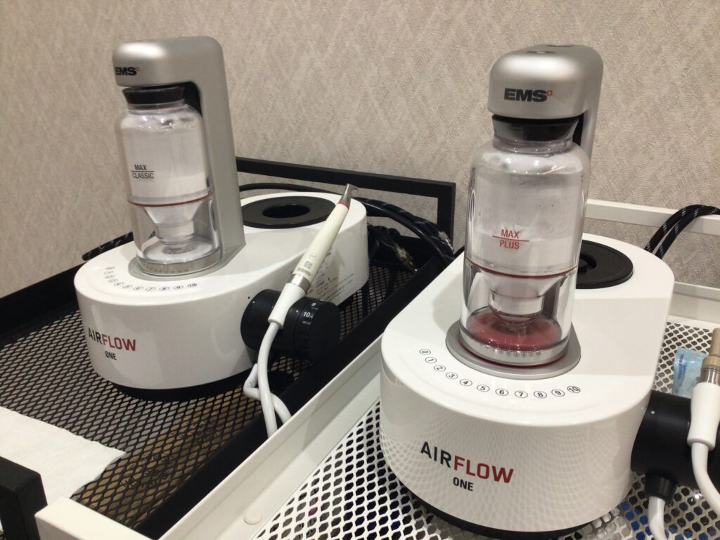 エアフローは水と微粒子パウダーを歯にジェット噴射させて歯面の汚れや着色汚れを取ってくれる機械です