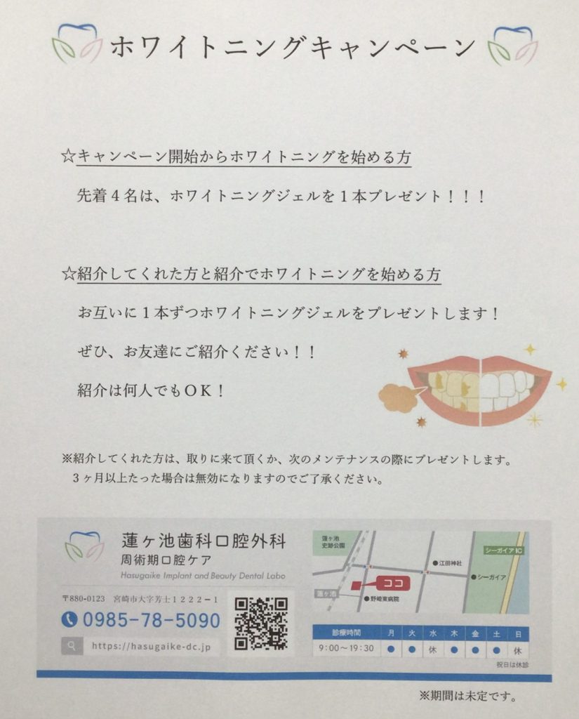 ホワイトニングキャンペーン✨ 投稿日 2023年3月1日 著者 staff カテゴリー お知らせ こんにちは‼︎蓮ケ池歯科口腔外科・周術期口腔ケアです✨ 3月1日よりホワイトニングキャンペーンを行います‼︎ ※ご予約順ではありませんのでご了承ください。 ホワイトニングに興味がある方、この機会に是非♪ #宮崎 #蓮ケ池 #アライナー矯正 #インプラント #ホワイトニング #スポーツ用マウスピース #ジルコニア #セラミック #親知らず抜歯 #白玉点滴 #口腔外科 #親知らず #周術期口腔ケア #マイナンバーカード