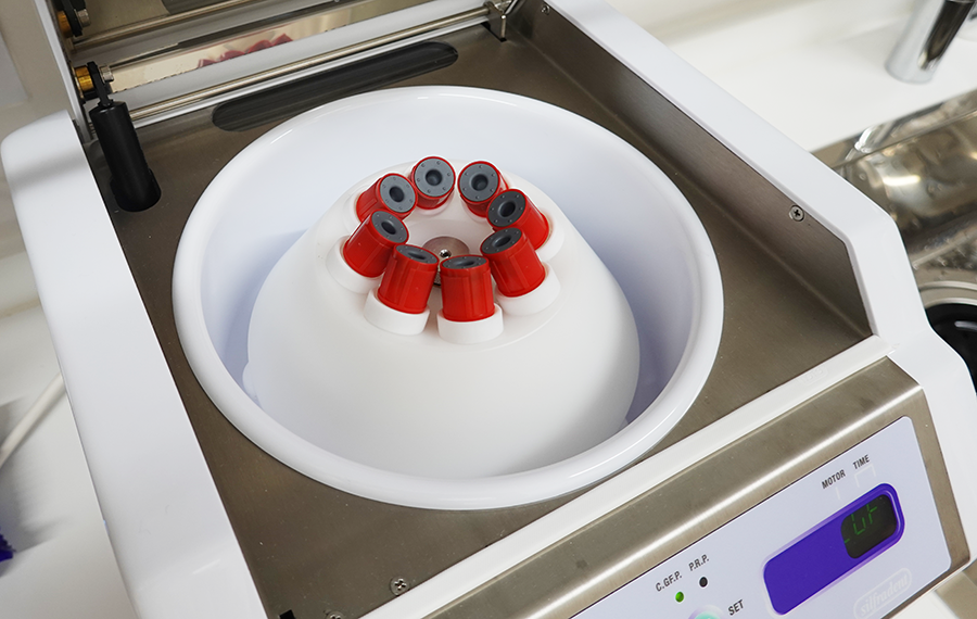 CGF治療とは、骨や歯茎などが足りない場所に、ご自身の血液を特殊な遠心分離器にかけてできたゲル状のフィブリンと濃厚血小板をいれて再生を促すものです。